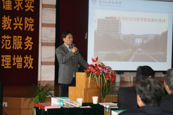 医学部党委书记陈智代表医学部致欢迎词。他代表医学部党政和全体师生对校友的到来表示热烈的欢迎,对校友们一致以来关心支持学部的发展表示衷心的感谢。陈智书记向校友们介绍了四校合并以来医学部的发展情况,着重介绍了学部整体搬迁至紫金港校区之后,在教学、科研、医疗上的所取得的成绩。听到母校的快速发展,尤其是科研上的突飞猛进,校友们感到自豪,纷纷表示祝贺。