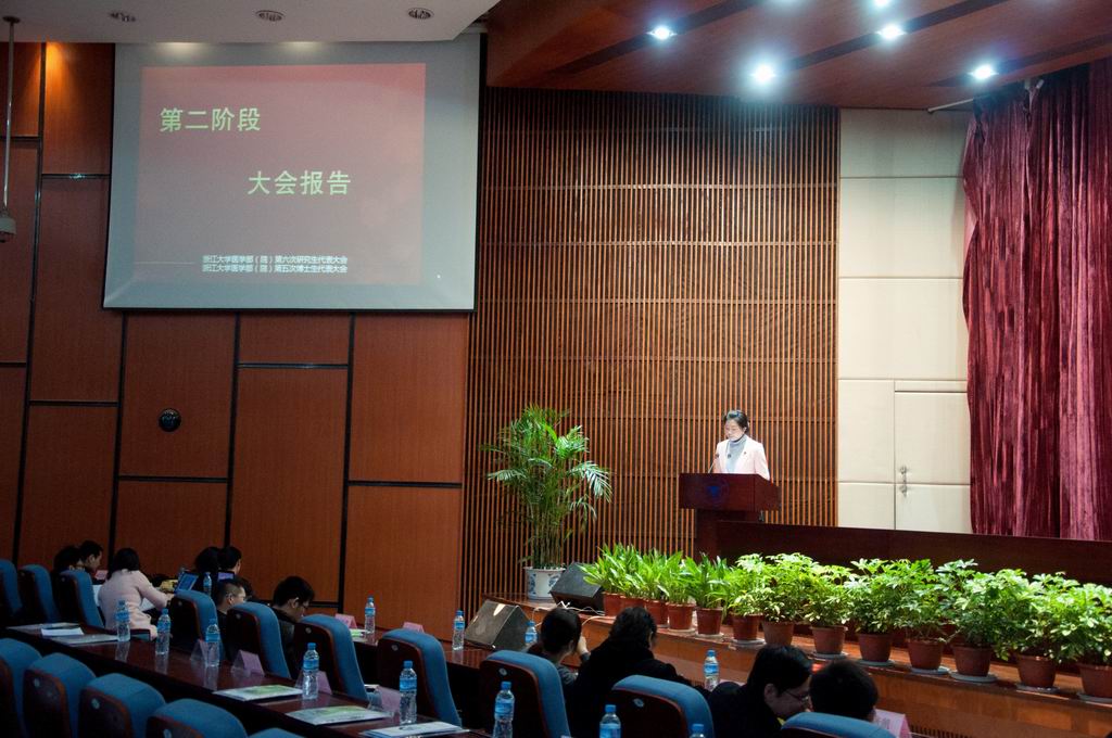 浙江大学党委研究生工作部副部长陈凯旋老师、医学部党书记张小玲老师分别致辞,对上一届研会的工作表示了充分的肯定,对新一届研会工作提出了殷切的期望。随后,苏逸同学代表第五届研究生会主席团做了工作报告,对六年来研博会的的工作进行了简要回顾,并对新一届研究生会提出了中肯的建议。大会审议并通过《浙江大学医学部(院)研究生会章程(草案)》、《浙江大学医学部(院)博士生会章程(草案)》浙江大学医学部(院)第六次研究生代表大会、第五次博士生代表大会选举办法(草案)》以及《浙江大学医学部(院)第六次研究生代表大会、第五次博士生代表大会监、计票人名单(草案)》。