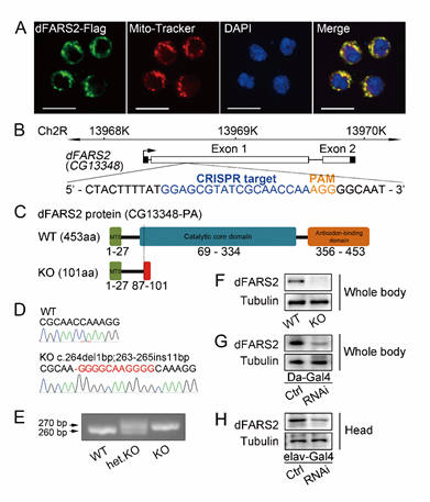 本研究利用CRISPR/CAS9技术以及UAS/GAL4系统,构建了FARS2缺陷的果蝇模型,发现FARS2缺陷果蝇存在明显的发育迟缓现象。且神经特异性FARS2缺陷的成年果蝇除发育迟缓以外,亦表现出了大脑变小和癫痫等表型。后续研究表明FARS2缺陷导致线粒体tRNAPhe氨酰化水平降低、线粒体tRNA代谢异常、线粒体复合体水平降低、呼吸链复合体酶活性降低,线粒体功能障碍进而影响细胞的生长发育。
